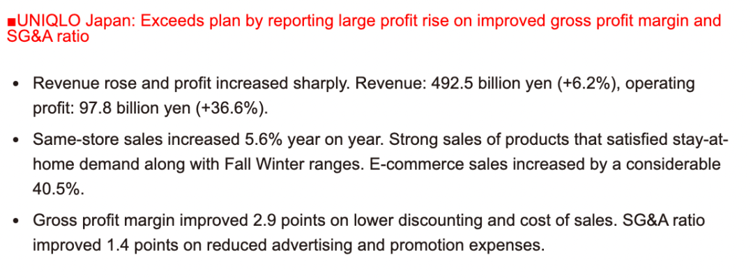 优衣库更把电商表现和目标写进每季度财报的重点摘要里。2021上半财年最新数据显示,日本优衣库的电商零售增长了40.5%。