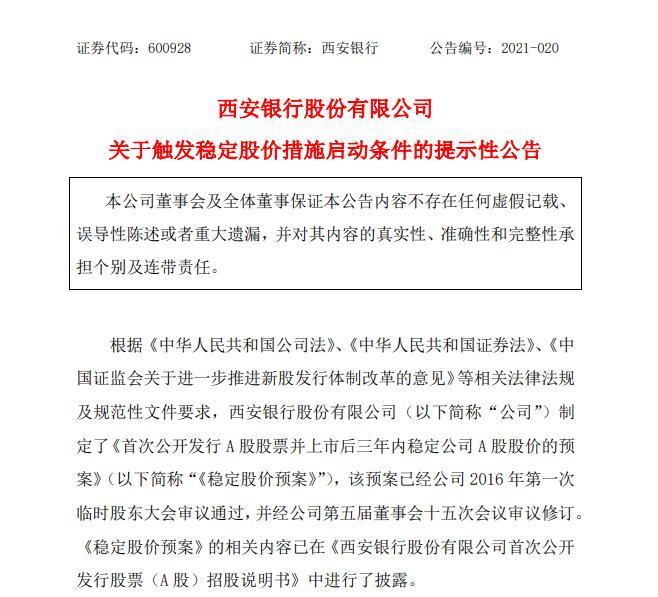 根据西安银行此前制定的《首次公开发行 A 股股票并上市后三年内稳定公司A股股价的预案》(简称”《稳定股价预案》“),西安银行股票上市后3年内,如连续20个交易日(股票全天停牌的除外)的收盘价均低于最近一期末经审计的每股净资产,西安银行、5%以上股东及实际控制人的一致行动人、董事(不包括独立董事)和高级管理人员等相关主体将启动稳定公司股价的相关程序并实施相关措施。