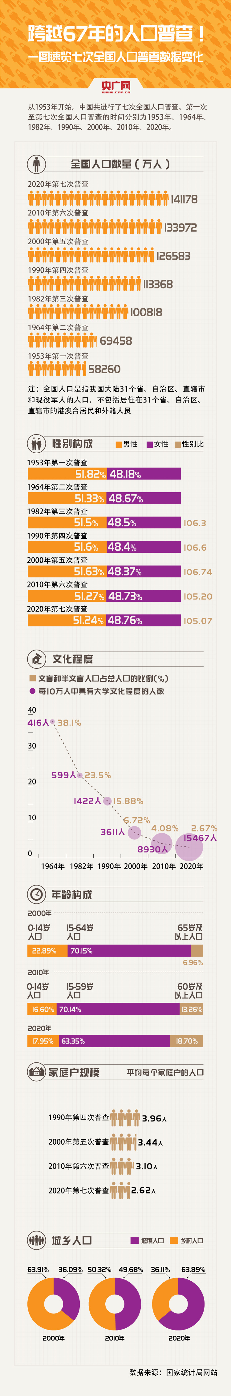从1953年开始,我国进行了七次全国人口普查。全国人口、性别构成、年龄构成、文化程度……67年来,这些方面的数据都发生了怎样的变化?你关心的都在这里↓
