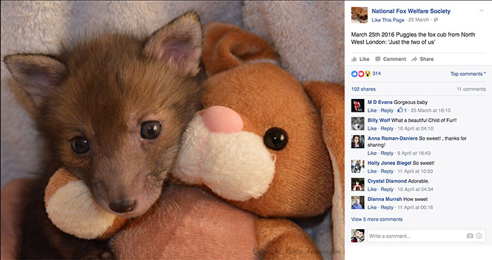 Puggle是一只明星小狐狸,刚出生两周的它被美国国家狐狸福利社(National Fox Welfare Society)的工作人员发现并救助,从此开心的在NFWS住了下来。