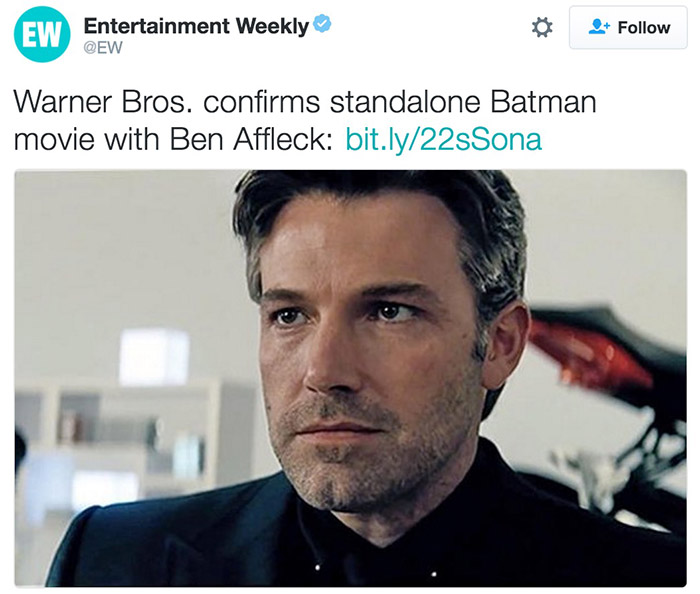 《蝙蝠侠大战超人:正义黎明》口碑扑街后,关于本·阿弗莱克将自导自演一部全新蝙蝠侠电影的消息就从没停过。今天,华纳兄弟终于确认,一部由本阿弗莱克亲自执导的蝙蝠侠电影已被提上日程。