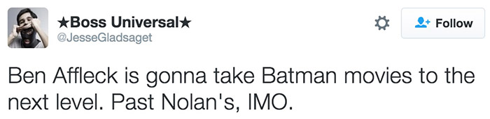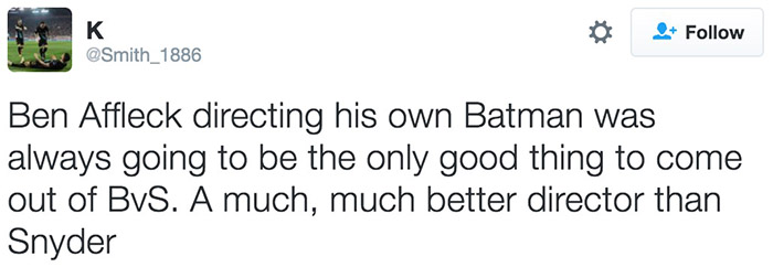 有网友表示:“如果说《超蝙大战》还有什么价值的话,那就是逼得本阿弗莱克决定亲自执导自己的蝙蝠侠电影了。作为导演,本·阿弗莱克比扎克·斯奈德强太多了。”
