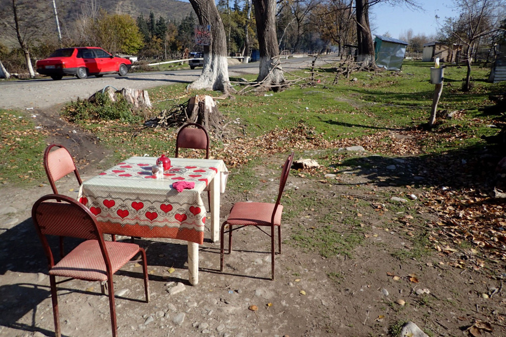 世界上最孤独的咖啡馆在阿塞拜疆首都巴库的路边。泥地里只放着一张破塑料桌,桌子上盖着乡村混搭风的油布,胡乱摆着廉价的盐瓶、糖碗,看上去就有股倒胃口的油腻。