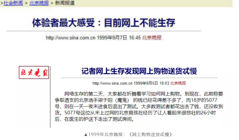1999年,国家信息产业部联合多家媒体主办了“72小时网络生存测试”,主办方提供床板、拨号网络、纸巾、现金电子货币总共三千元,要求测试者72小时内不许离开房间。在国内工薪阶层平均月薪一千元的时代里,三天能动用三千元巨款,但还是有不少人认为测试者一滴水都买不到。