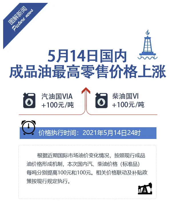 国家发展改革委微信公众号5月14日消息,根据近期国际市场油价变化情况,按照现行成品油价格形成机制,自2021年5月14日24时起,国内汽、柴油价格每吨均提高100元。