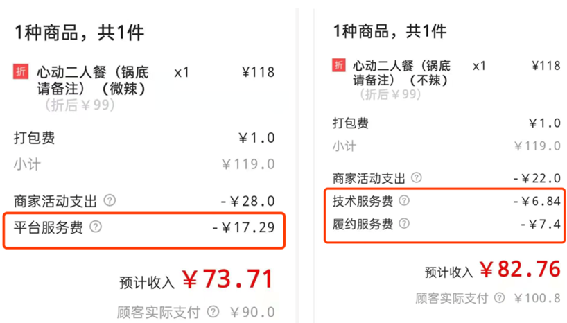 技术服务费的比例是固定的,这是商家使用外卖平台需要支付的固定支出;履约服务费是浮动的,受订单价格、配送距离、配送时段影响而动态变化。