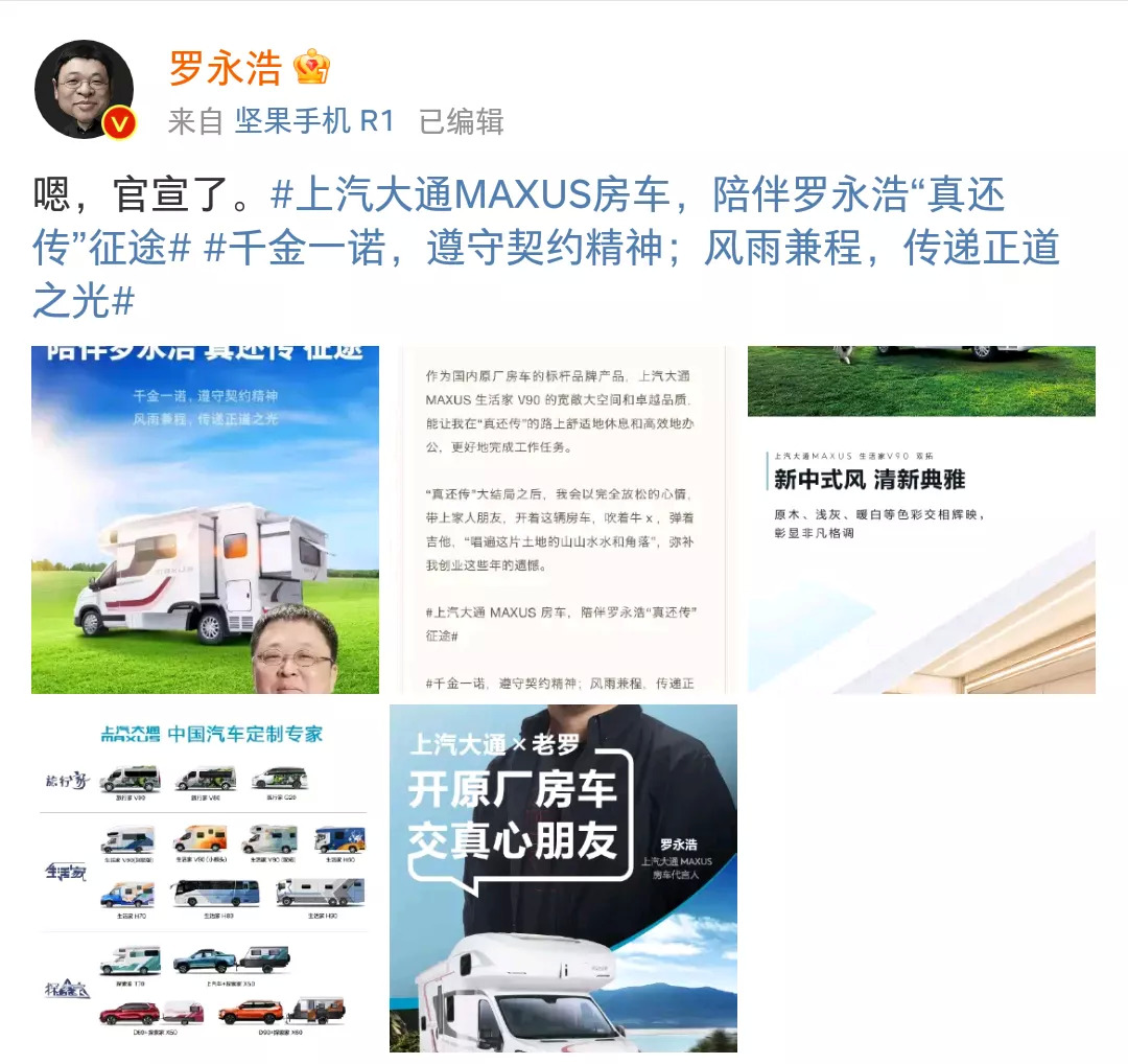 最近,罗永浩官宣成为上汽大通MAXUS房车代言人,官宣文案上写着:上汽大通MAXUS房车,陪伴罗永浩“真还传”征途;千金一诺、遵守契约精神;风雨兼程,传递正道之光。网友们直呼,这文案很老罗,一边给品牌塑造一个质量不错、对用户负责的形象,一边又间接表达了对自己的认可和赞美……
