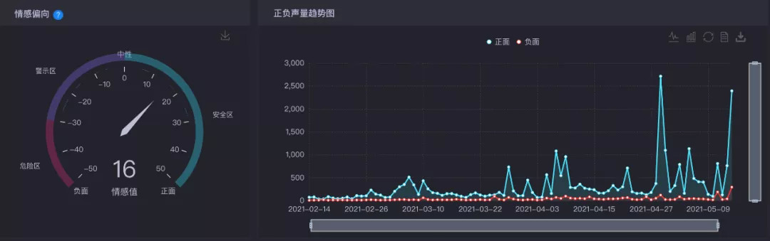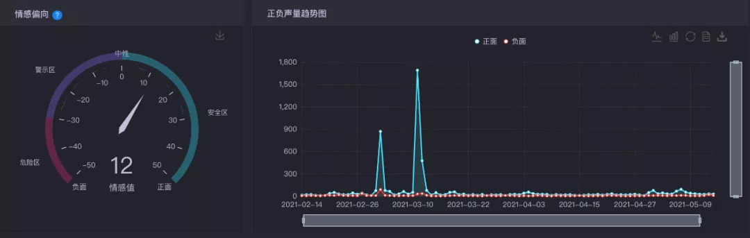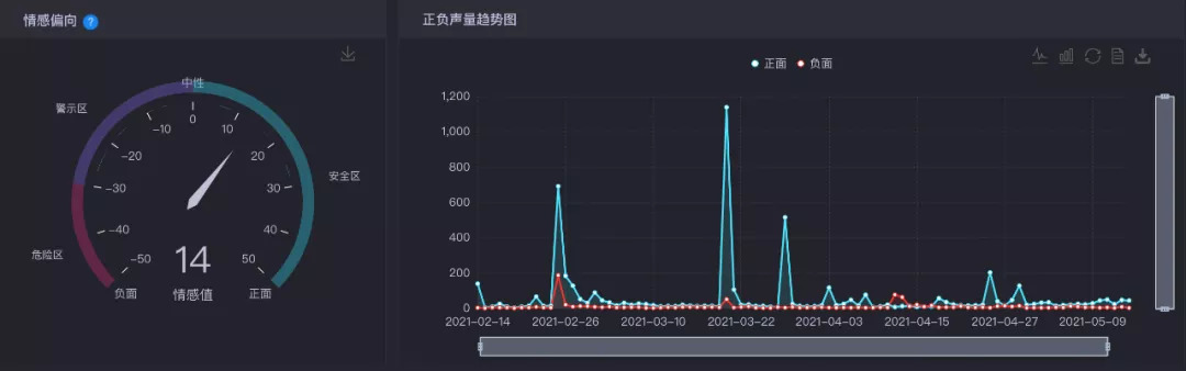 另外,从情感值来看,杨天真处于安全范围,情感值为14,而且在以往参与节目的节点来看,杨天真可以说是事件型正面人物,阶段性的可以获得网友们的正面支持。