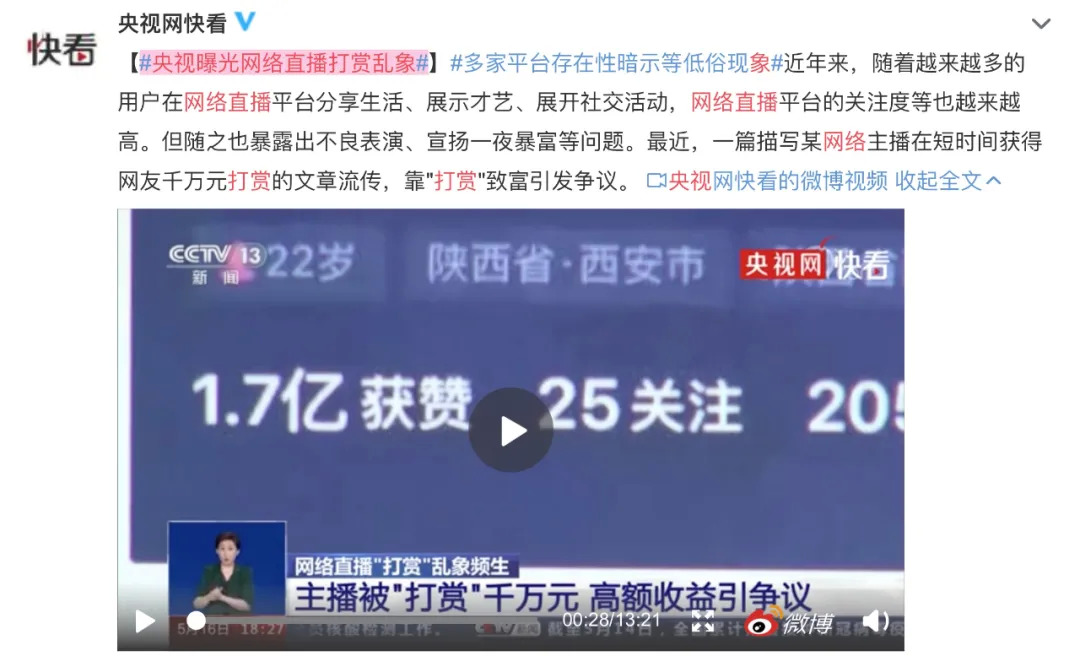 去年6月初,广电总局率先发布了《国家网信办等8部门集中开展网络直播行业专项整治行动》的通知,第一条就提到“针对网民反映强烈的直播打赏严重冲击主流价值观问题,多部门将启动相关行动。”