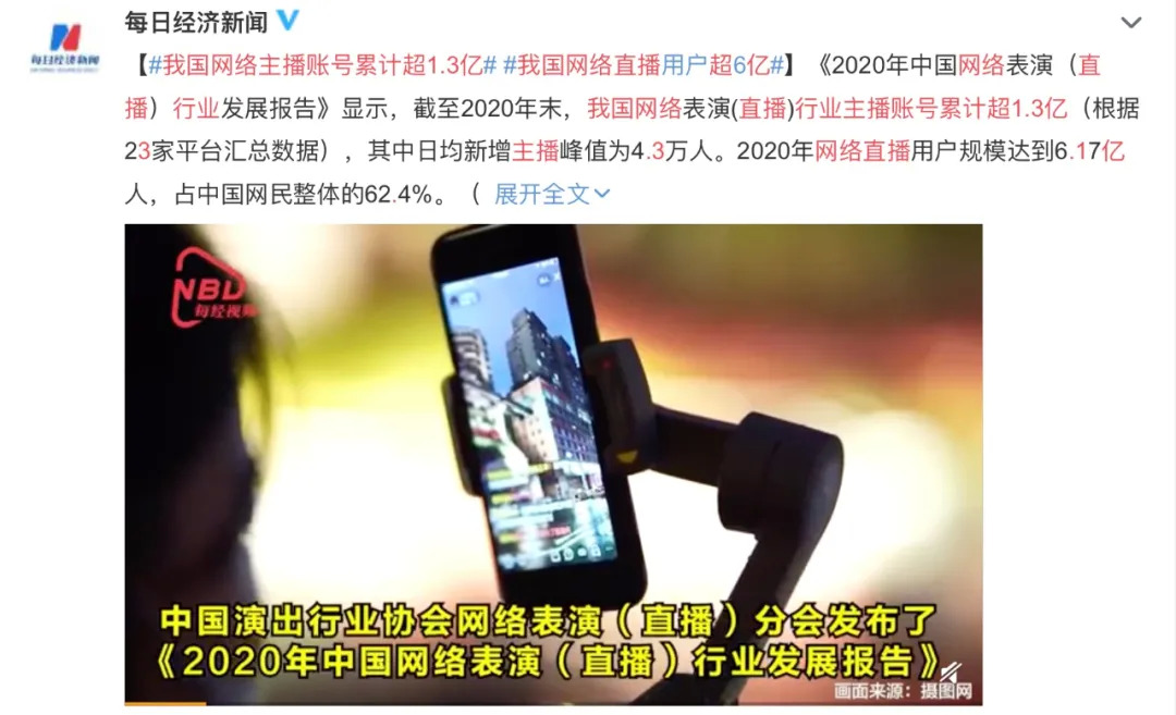 一方面,据刚发布的《2020年中国网络表演(直播)行业发展报告》显示,我国网络直播行业主播账号累计超1.3亿,网络直播用户规模达到6.17亿人,直播行业发展蓬勃;另一方面,直播是如今各类线上文娱平台的刚需功能,连图文社区、音乐流媒体里都纷纷增设有直播专区。