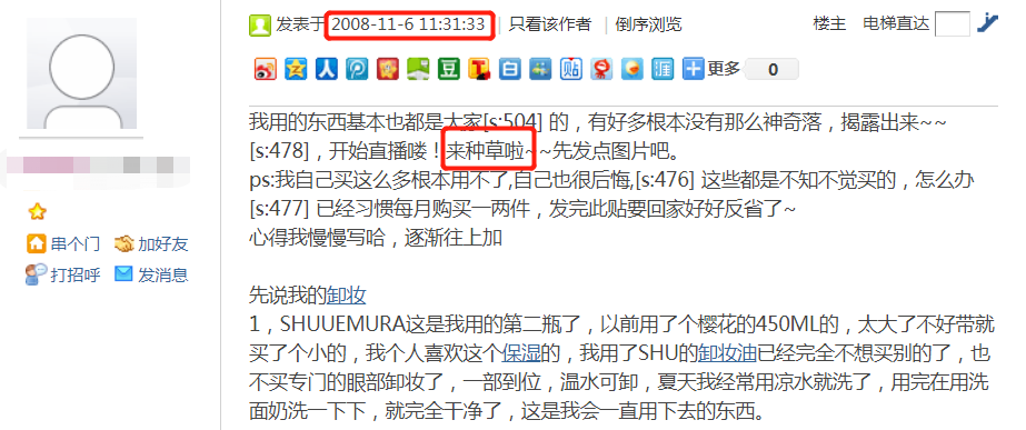 “种草”这个概念是什么时候诞生的?这个问题可能没有准确答案。比如在百度显示的搜索结果里,符合当前语境的“种草”用法(区别于它的本意,即种植植物)最早可以追溯到2008年:在一个叫做Only Lady的女频网站上,有网友在分享美妆产品的日志中使用了“种草”一词来推荐美妆产品。