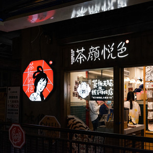 2013年的时候,吕良以媳妇儿为原型,画出了茶颜悦色的古典仕女logo。同年12月28日,在黄兴广场开出了首家门店,门头上,古风仕女图十分抢眼。