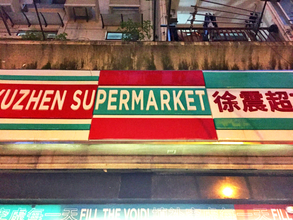 来到“徐震超市”已经是傍晚6点。在马路对面一眼就可以看到这家位于愚园路1386号的“超市”。红绿相间的招牌乍看之下很像山寨版的7-11——就和我们在市井小巷里看到的那种个体户开的廉价小超市别无二致。远远看去,“超市”内商品琳琅满目,简直让人有些怀疑是不是找错地方了。