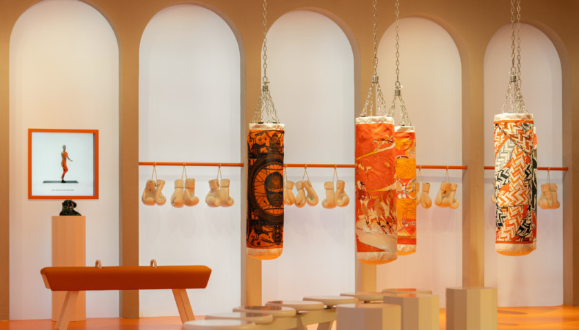 在这座健身馆里不仅可以激发澎湃四射的运动激情,同时可以定格您与朋友愉悦动人的#HERMESFIT精彩瞬间,以俏皮幽默点缀生活趣味。沙袋被爱马仕丝质方巾图案精心装饰,场地中央的拳击台兼具现场乐队表演和拍照空间双重作用,意趣非凡,彰显出突破自我的追求。