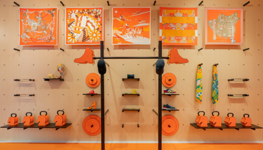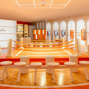 HermèsFit在成都打造了一个引人入胜的互动空间,邀请宾客前来探索无限精彩。 在量身打造的别样空间内,标志性的爱马仕橙色点缀四周,墙上饰有精美图案, 营造出乐趣十足、绮丽动感的氛围。宾客可以在一个以多元素和想象力构建而成的教室里体验健身课程,亦可看到一面挂满爱马仕定制杠铃和壶铃的器械墙以及作为拍照区域的拳击台和攀岩墙、果汁吧等。它们都为趣味运动提供了别样的解读方式, 通过新意视角巧妙糅合爱马仕卓越手工艺和别出心裁的自定义风格。