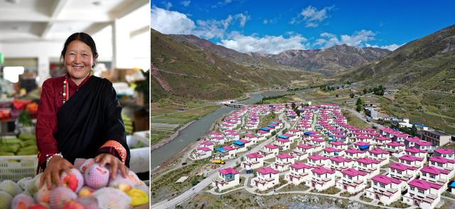 ↑左图为西藏自治区昌都市丁青县尺牍镇巴登村村民强珍在尺牍镇农贸市场自己的摊位前(2020年9月18日摄);右图为尺牍镇易地扶贫搬迁安置点一角(2020年9月18日摄,无人机照片)。2018年,强珍和家人从巴登村搬迁到安置点,并在尺牍镇农畜产品物流中心农贸市场做起了生意。