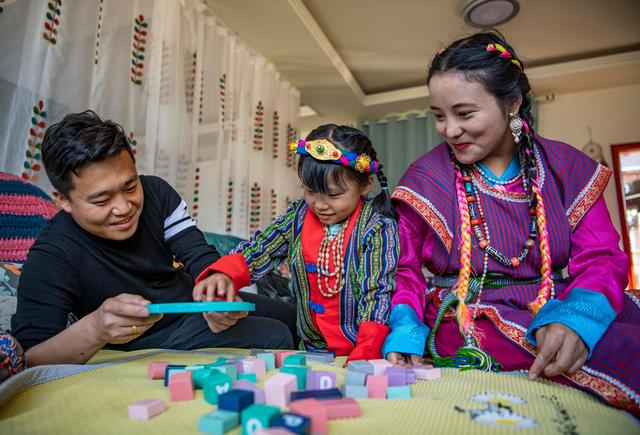 ↑2021年2月11日,在位于西藏林芝市墨脱县的家中,山西小伙张淳焕和门巴族妻子扎西玉珍陪女儿玩积木。