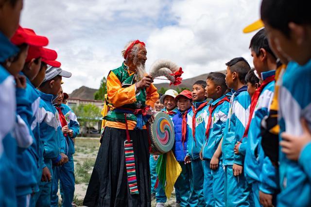 ↑2020年7月2日,国家级非物质文化遗产项目“久河卓舞”传承人尼玛在西藏山南市琼结县下水乡小学进行教学表演。