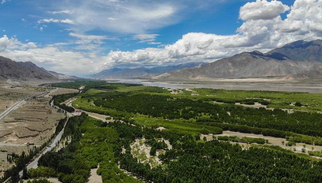 ↑雅鲁藏布江岸边绿树成荫,好似一道绿色长廊(2020年6月27日摄,无人机照片)。
