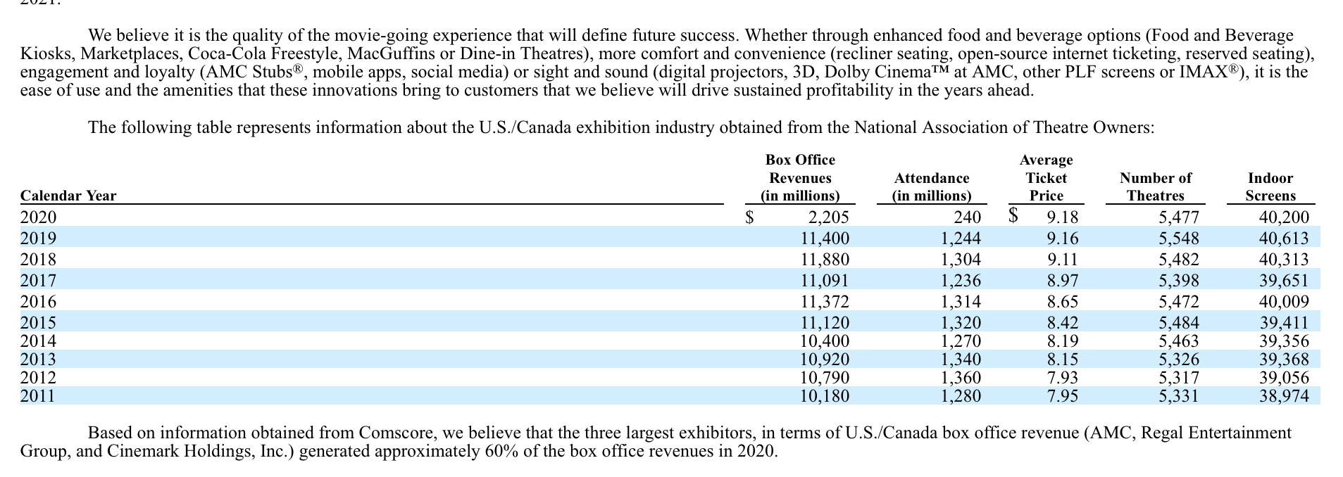在院线业务上,从市场总体情况来看,虽然中国内地总票房依旧未能超越北美,但在票房总量的增速上占有优势。AMC2020年财报显示,2011年到2019年十年以来,北美地区票房总量一直维持在101.8亿美元至118亿美元之间。与之相对照的是,2011年中国内地年度总票房为131亿,而2019年达到594.52亿。