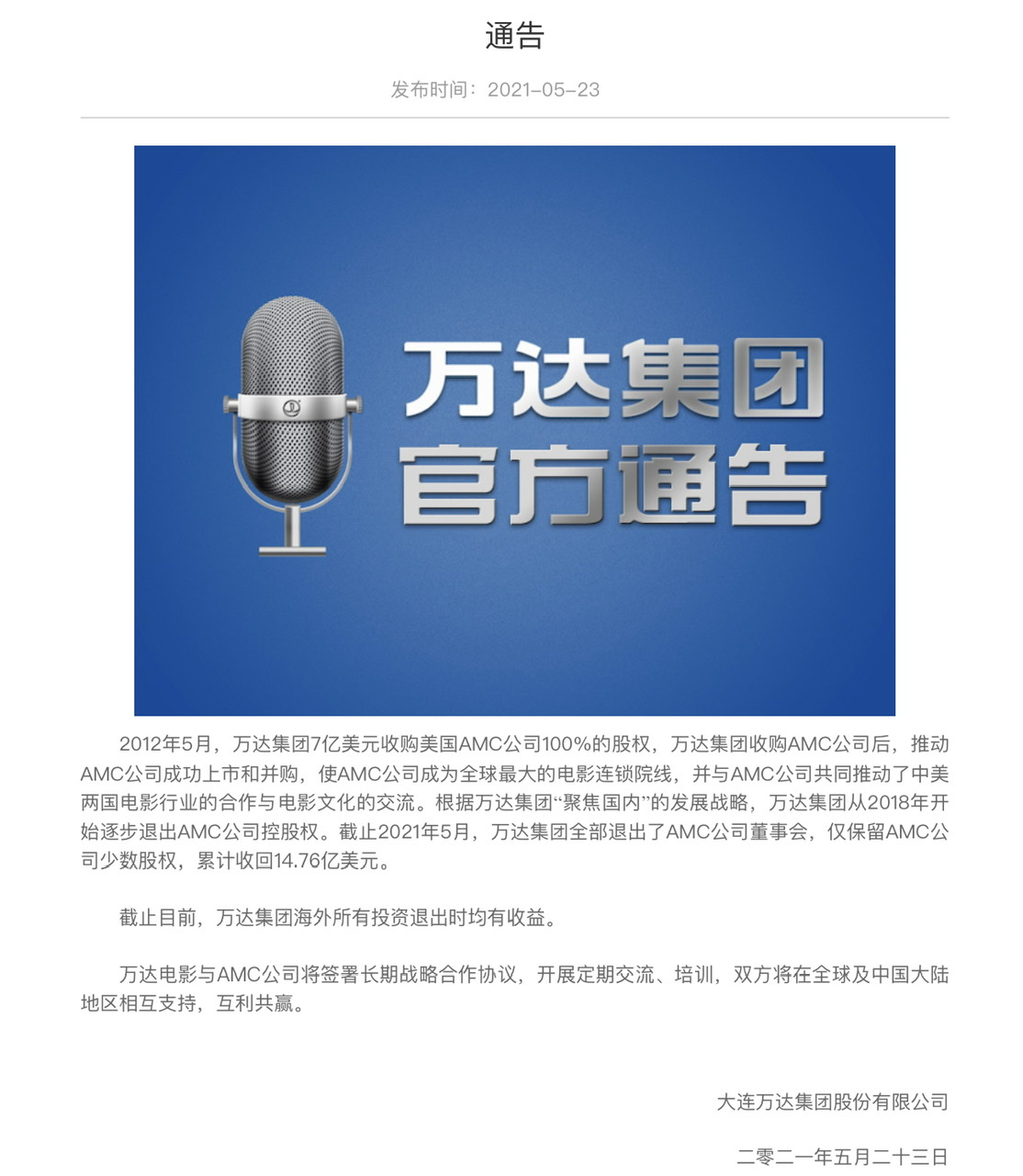 万达集团5月23日发布的官方通告表示,截至目前,万达集团海外所有投资退出时均有收益。公告亦表示,万达电影与AMC公司将签署长期战略合作协议,开展定期交流、培训,双方将在全球及中国大陆地区相互支持,互利共赢。