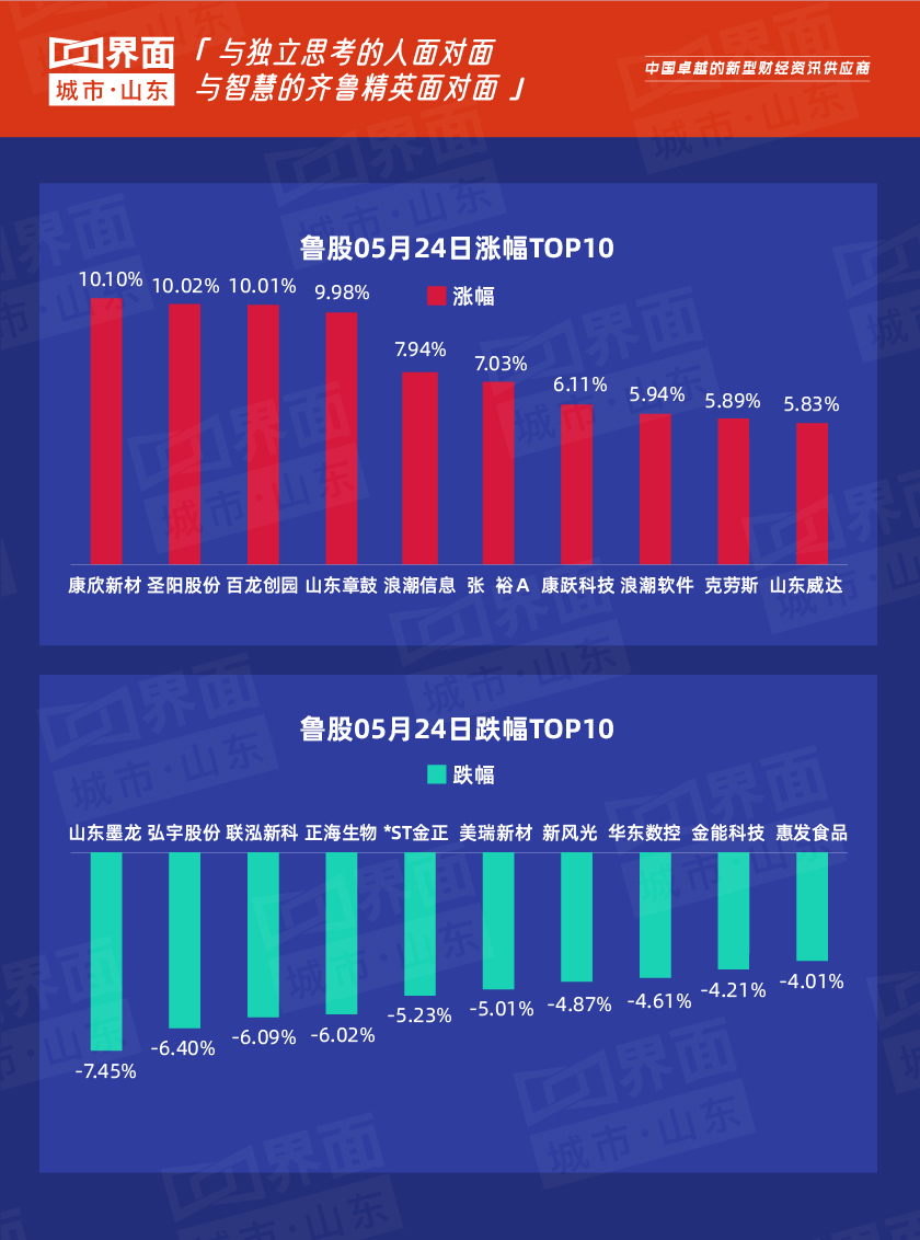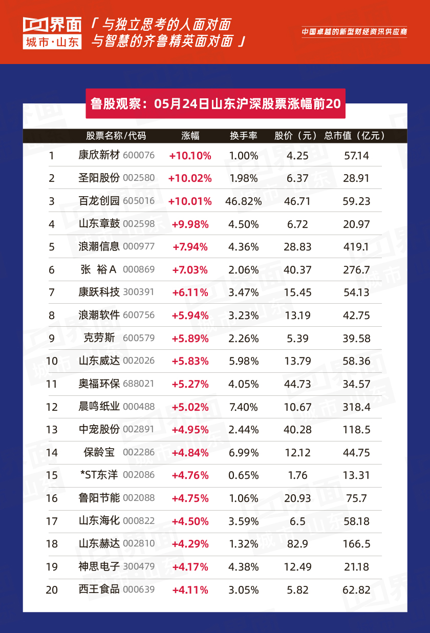 受大盘影响,5月24日,山东省内沪深股票有132只个股上涨,87只下跌,康欣新材领涨。