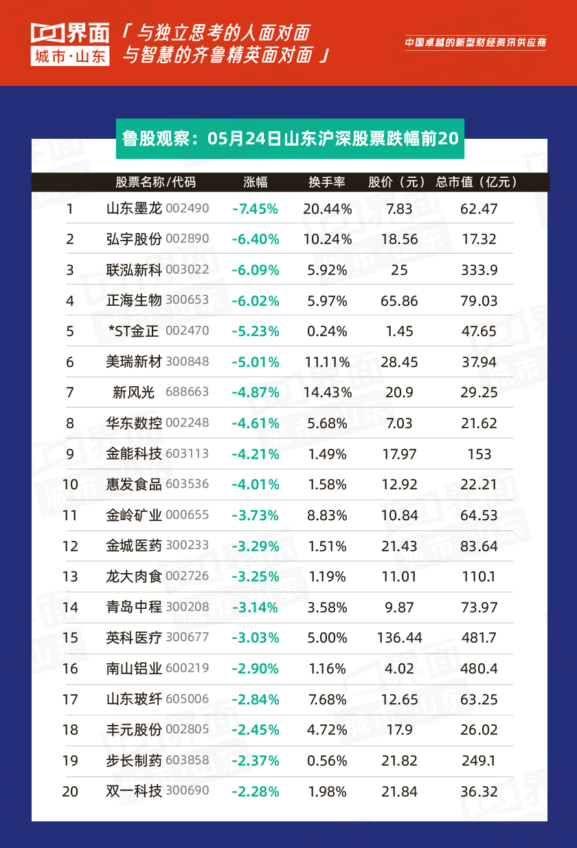 5月24日,山东132股上涨,15股持平,87股下跌。