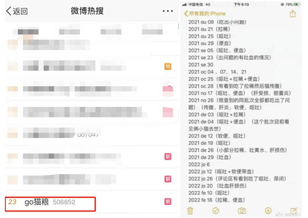 转折就来自2021年的一个热搜,2020年双十一销售的GO猫粮,出现大面积问题,有自媒体从业者做了一个统计。