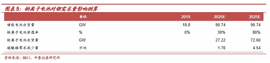 中泰证券有色团队认为,对比分析后认为与锂离子电池相比,钠离子电池能量密度较低,未来应用场景或主要集中于储能、低速新能源车及小动力领域,锂离子电池仍是新能源汽车电池主流技术路线。假设在2025年储能需求达到90gwh,钠离子电池在渗透率达到30%-80%,则碳酸锂需求量约减少1.70-4.54万吨,而碳酸锂届时的总需求量将达到100万吨以上,钠离子电池的应用不改碳酸锂中长期高景气周期。(具体测算见正文)