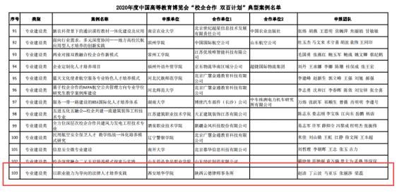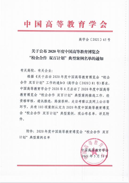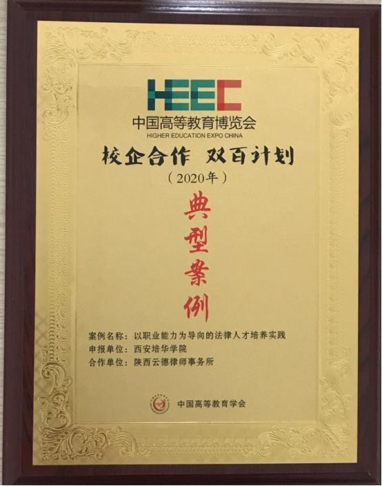 中国高等教育学会于2020年8月启动了2020年度中国高等教育博览会“校企合作 双百计划”典型案例推选工作,经资格审核、通讯推选、路演答辩、走访考察以及网上公示等环节,共有103项案例认定为2020年度中国高等教育博览会“校企合作 双百计划”典型案例,其中西安培华学院与陕西云德律师事务所共同合作的专业建设类案例——《以职业能力为导向的法律人才培养实践》,系全国唯一入选法学相关合作项目。