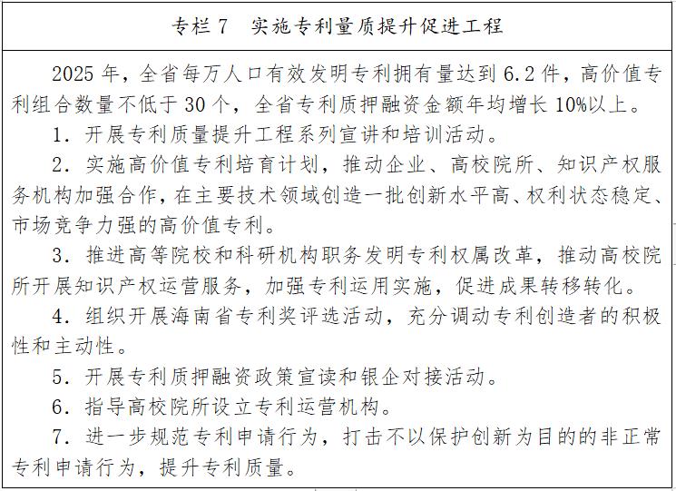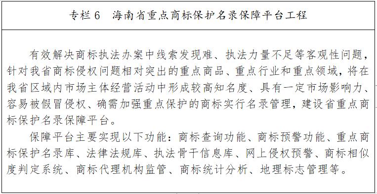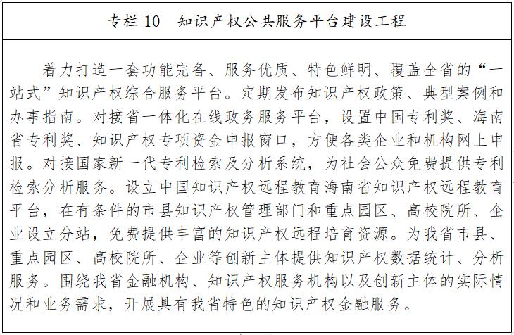 严格知识产权保护,以三亚崖州湾科技城作为试点区域,对接国际通行规则和最高标准,探索建设崖州湾知识产权特区。做好中国国际消费品博览会等展会知识产权保护服务,加强重点商标保护名录管理;加强知识产权创造和运用;强化知识产权管理和服务。