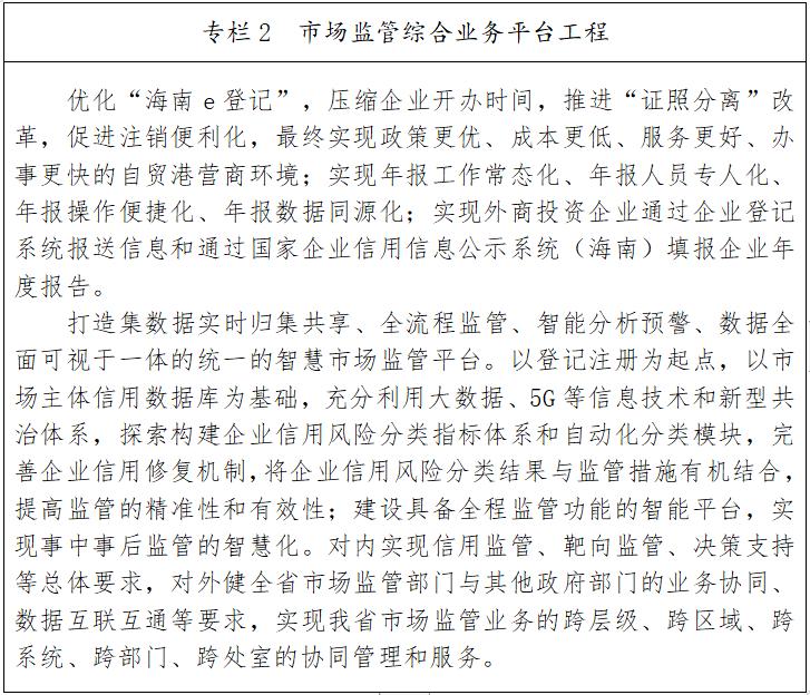 5月26日,海南省市场监督管理局印发《海南省“十四五”市场监管规划(琼府办〔2021〕17号)》(以下简称:《规划》)。《规划》提到,到2025年,海南省市场主体目标数量为320万户。《规划》总体目标要求,到2025年,基本建立符合海南自由贸易港发展要求的高标准市场体系,实现海南自由贸易港市场监管能力现代化。