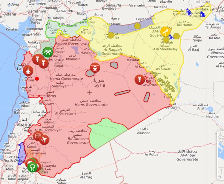 在叙利亚东南部与约旦和伊拉克交界地区,得到美国和约旦支持的反对派武装占据一隅;在叙利亚东部还有零星地区为ISIS据点。