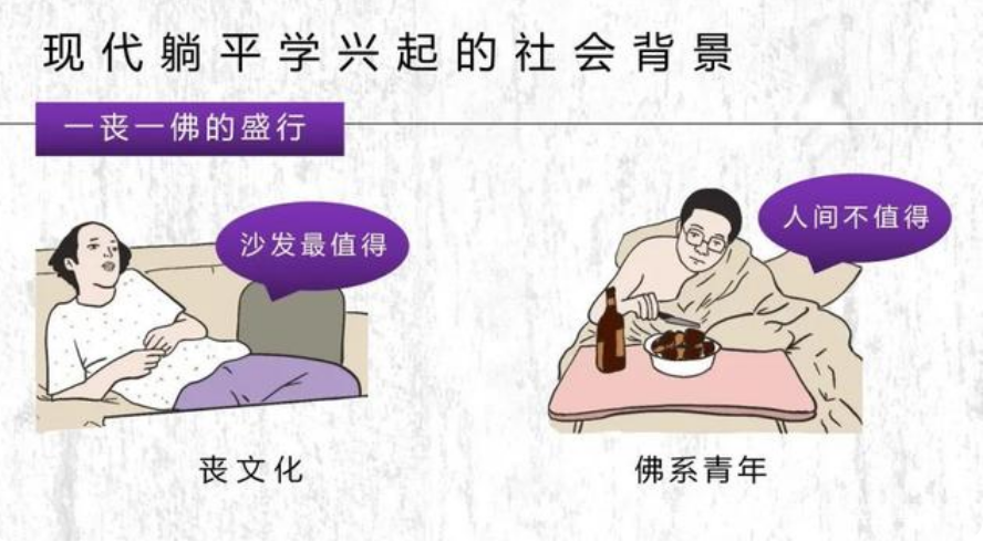 如2016年,“葛优躺”的颓废坐姿火爆网络世界,如何表达颓废的生活,“葛优躺”最合适不过。2017年,“佛系”一词成为年轻人的常用语,其代表的是一种不以物喜不以己悲,以一切随缘为精神指导的生活态度。2018年,“人间不值得”走红,初衷本是想安慰那些被困难、挫折绊倒的人能够活得快乐些,不要被暂时的不如意所击倒, 后来被解读成了看淡人生的一种自我安慰。