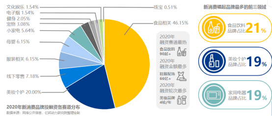 中国新消费发展从2018年开始迅速壮大,2020年中国品牌渗透率高达91.4%,成为新消费品牌爆发元年,实现全面领跑。截止2020年12月,新消费品牌约有200起融资事件,食品和美妆两大赛道备受资本青睐。2020年融资过亿的新消费品牌超过30家,流水过亿的新消费品牌超200家。据不完全统计,在成功兴起的新消费品牌中,食品饮料、美妆个护和家用电器成为占比最高的三个领域。