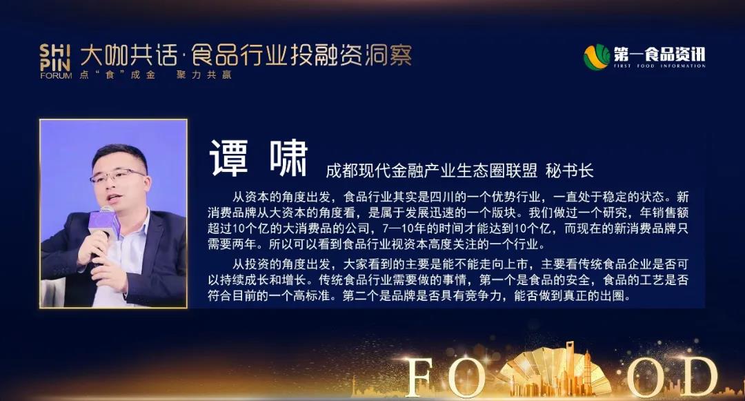 从资本的角度出发,食品行业其实是四川的一个优势行业,一直处于稳定的状态。新消费品牌从大资本的角度看,是属于发展迅速的一个版块。我们做过一个研究,年销售额超过10个亿的大消费品的公司,过去需要7—10年的时间才能达到这个规模,而现在的新消费品牌有的只需要两年。所以可以看到食品行业是资本高度关注的一个行业。