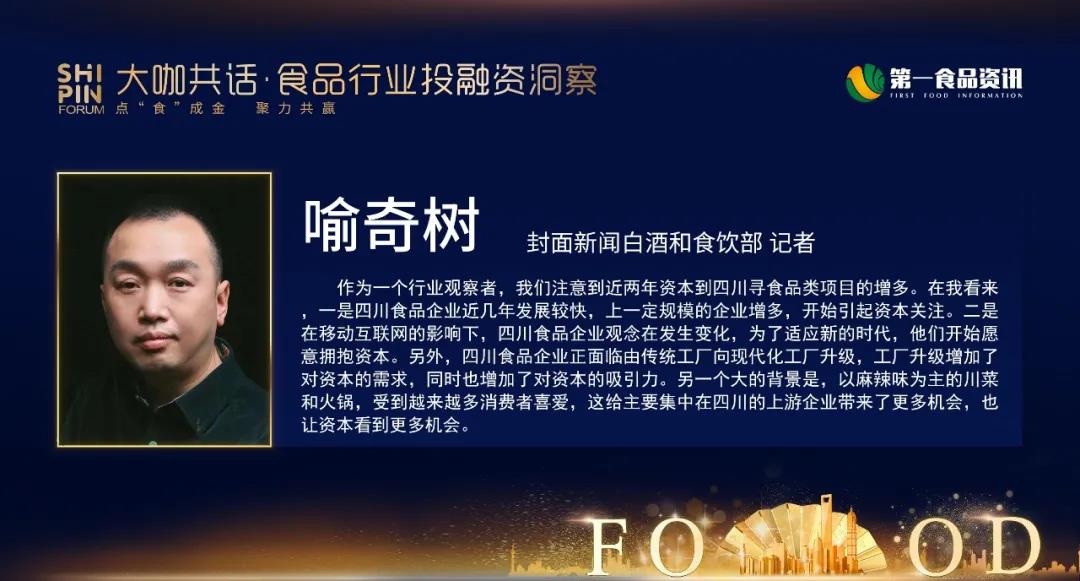 作为一个行业观察者,我们注意到近两年资本到四川寻食品类项目的增多。在我看来,一是四川食品企业近几年发展较快,上一定规模的企业增多,开始引起资本关注。二是在移动互联网的影响下,四川食品企业观念在发生变化,为了适应新的时代,他们开始愿意拥抱资本。另外,四川食品企业正面临由传统工厂向现代化工厂升级,工厂升级增加了对资本的需求,同时也增加了对资本的吸引力。