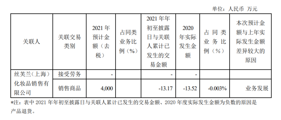 顺着上海家化与丝芙兰的这层关系,上海家化于日前发布《上海家化关于2021年度与丝芙兰(上海)化妆品销售有限公司日常关联交易的公告》,预计今年双方销售商品金额达4000万元。