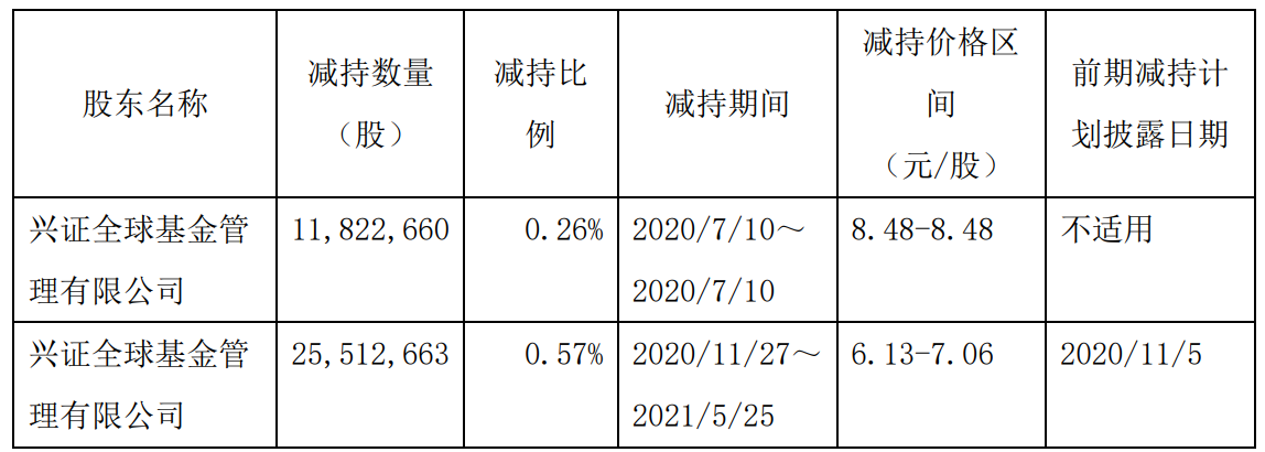 公告显示,在此之前,锁定期届满后,兴证全球基金已经实施了两次减持。