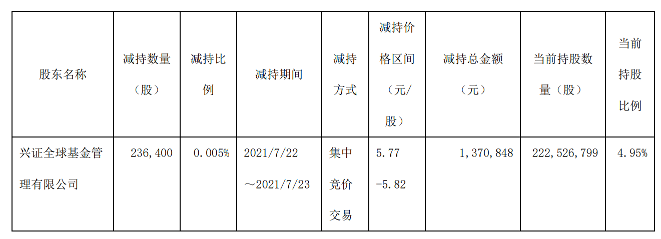 减持计划的减持时间过半,7月22日-23日,兴证全球基金通过集中竞价共计减持23.64万股,减持价格区间5.77-5.82元/股,减持总金额137.08万元。