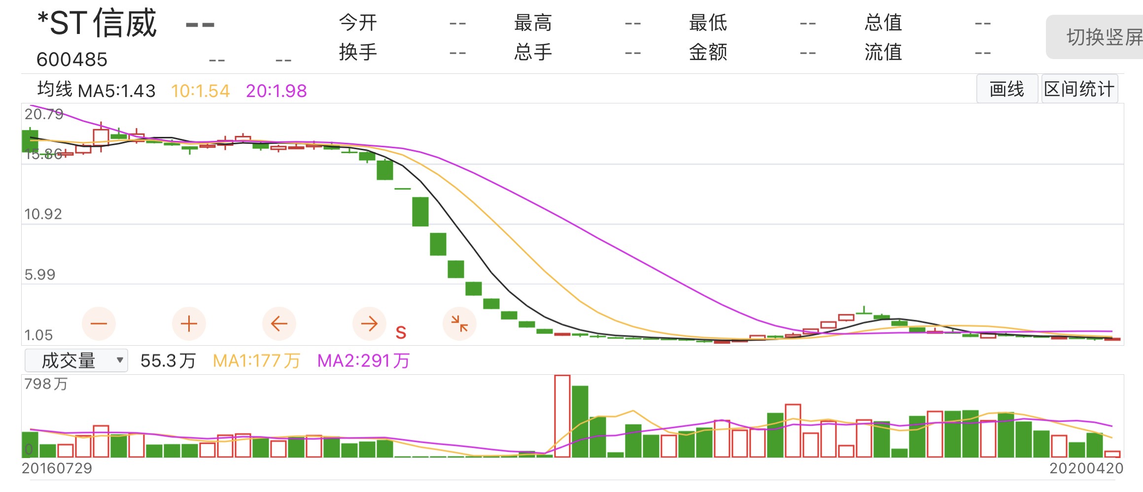 *ST信威2014年通过借壳中创信测登陆资本市场,同年更名为信威集团,随后三年(2014年至2016年)该公司分别盈利18.12亿元、19.01亿元、15.27亿元。然而,此后,该公司被市场质疑其海外业务造假、隐瞒债务等问题,其股票自2016年12月26日开始长期停牌,直到2019年7月12日才复牌,复牌后其股价一路跌停,一度收到42个连续“一”字跌停板。到2020年4月20日,*ST信威自再次停牌前,其股价已经从2019年7月复牌前的14.59元/股跌到了1.39元/股。