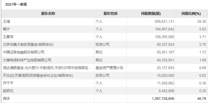 然而,去年4月21日,*ST信威再次进入连续停牌期,至今未复牌,12.07万户股东被“困”在这只股票。从2021年一季度报告披露的十大股东情况来看,截至3月31日,北京华赛大有投资基金(有限合伙)仍持有*ST信威8033.78万股(占总股本的2.75%),中国证券金融股份有限公司持股5026.11万股(占总股本的1.72%),大唐电信科技产业控股有限公司持股4933.50万股(占总股本的1.69%),信达澳银基金-光大银行-中航信托-天启520号中创信测定增基金持股2015.76万股(占总股本的0.69%),天兆欣(天津)股权投资基金合伙企业(有限合伙)持股1802.09万股(占总股本0.62%)。