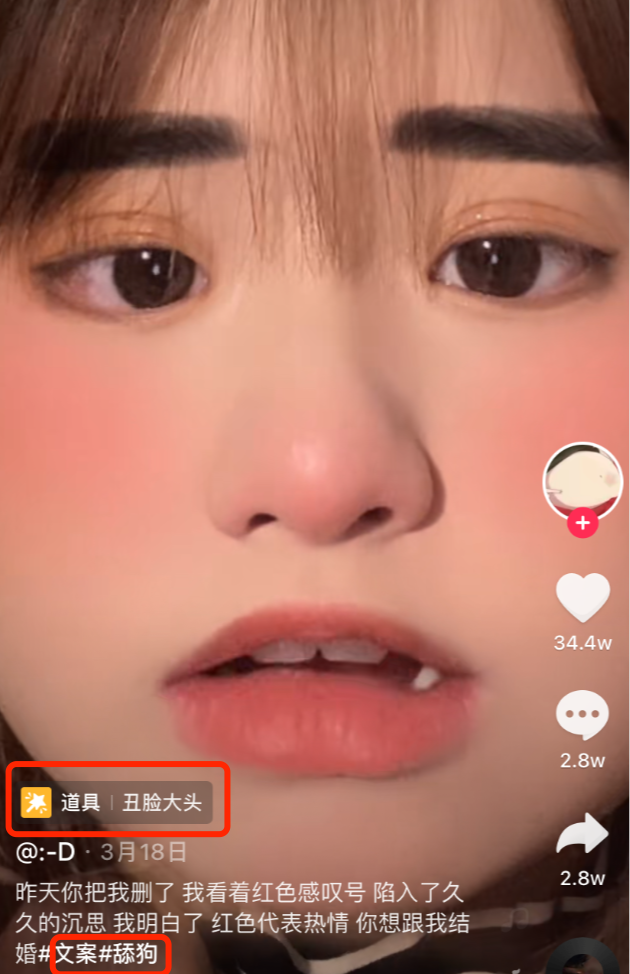 这位“:-D”,从今年2月开始“怼脸出镜”,陆续录制了一些“我的宝”和“舔狗”话题的视频,点赞数在1-3万左右。直到3月18日,“:-D”发布了一条新的“舔狗”视频,配合“丑脸大头”的道具做出各种委屈的表情,获赞数一下子达到34.4万,音源和道具更是被无数抖音用户反复利用,并进行二次创作。