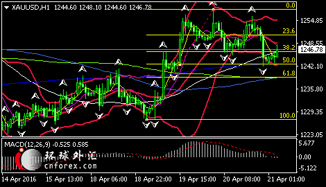 国际现货黄金周四(4月21日)亚市盘中受到下方1242美元/盎司水平支撑有所回升,短期存下行风险;如图,1小时图显示,目前金价受支撑于MA200,此支撑位是短期上行趋势的Fibo50%的回调位,MACD动能柱运行于零轴紧下方,下行动能缺乏。不过,金价下破MA200后将进一步测试1239美元/盎司强支撑位。整体而言,金价维持上行趋势。