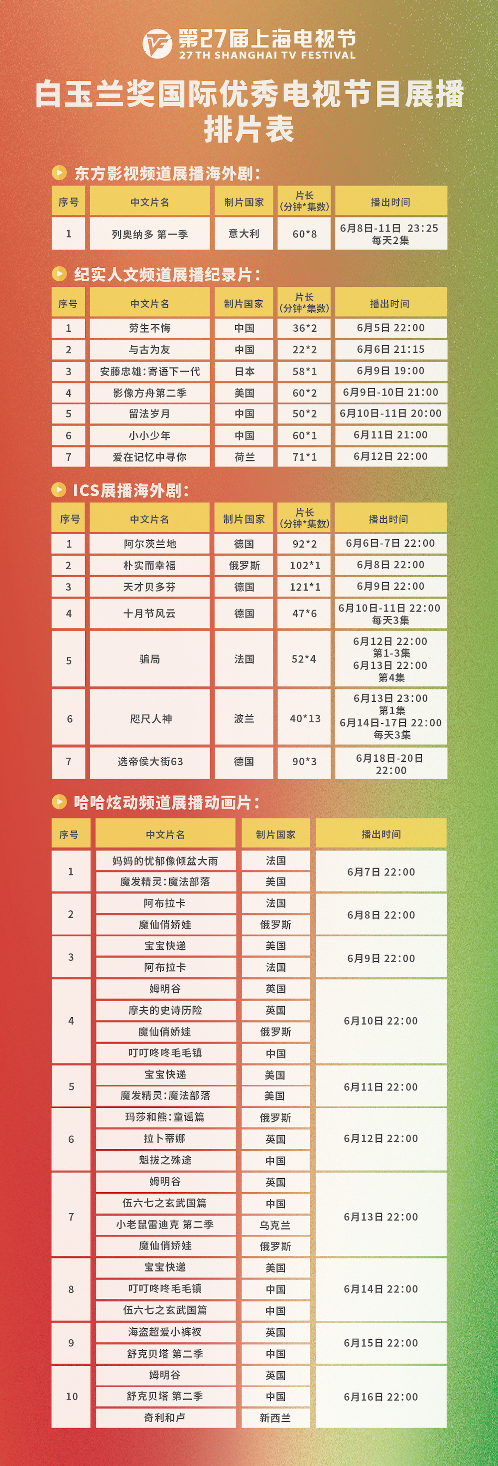 第27届上海电视节将于2021年6月6日拉开帷幕,作为第27届上海电视节重要板块的“白玉兰奖国际电视节目展播”,也于5日起在上海广播电视台的四个频道陆续推出。