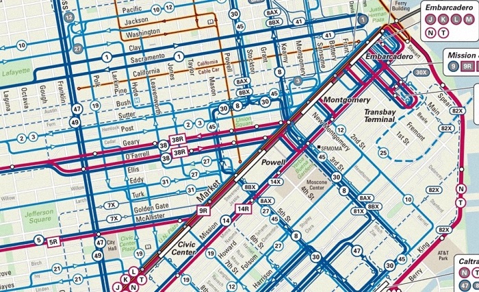 实用的联运地图少之又少,而远比地铁线路图复杂的公交线路图才是真正的问题,城市的公交网络实在太过庞大。研究人员希望能看到更加方便实用的公交线路图,不少设计者也提出了相同的理念——如旧金山更新后的Muni地图利用线条颜色深浅来指示车次频率就是个不错的做法。