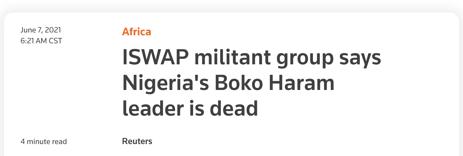 根据路透社周日听到的一段录音,一位自称是极端组织“伊斯兰国西非省”(ISWAP)头目阿布·穆萨布·巴尔纳维(Abu Musab al-Barnawi)的人在录音中称,阿布巴卡尔·谢考在一场战斗后被“伊斯兰国西非省”武装分子追赶,期间引爆了一个爆炸装置,于5月18日左右死亡。