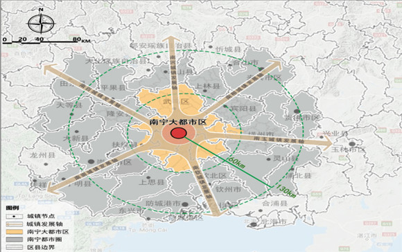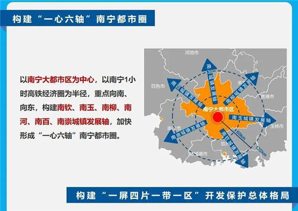 集聚的关键是交通,因此南宁“十四五”规划纲要提出,加快形成“一心六轴”南宁都市圈,以1小时高铁经济圈为半径,中心就是南宁东站。