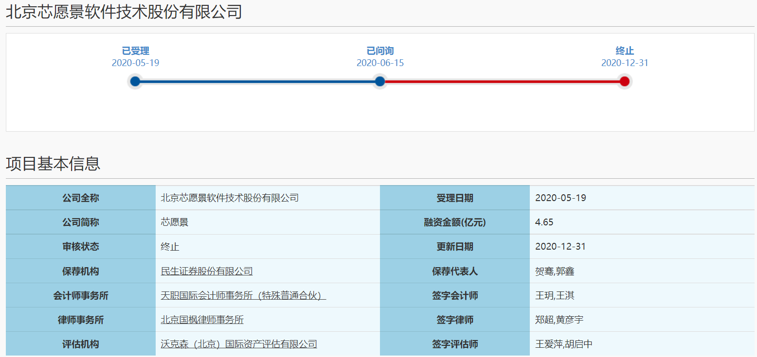 6月2日,民生证券股份有限公司披露关于北京芯愿景软件技术股份有限公司首次公开发行股票并在深交所主板上市的辅导基本情况资料表。