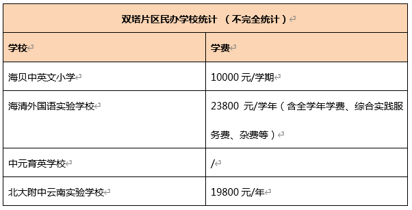 但仔细梳理后发现,目前区域内建成并投入使用的学校中,除了南坝中心学校为公办外,其余的海贝中英文小学、海清外国语实验学校、中元育英学校(小学+初中)、北大附中云南实验学校(小学+初中+高中)等均为民办学校,且学费基本都在2万+/学年。